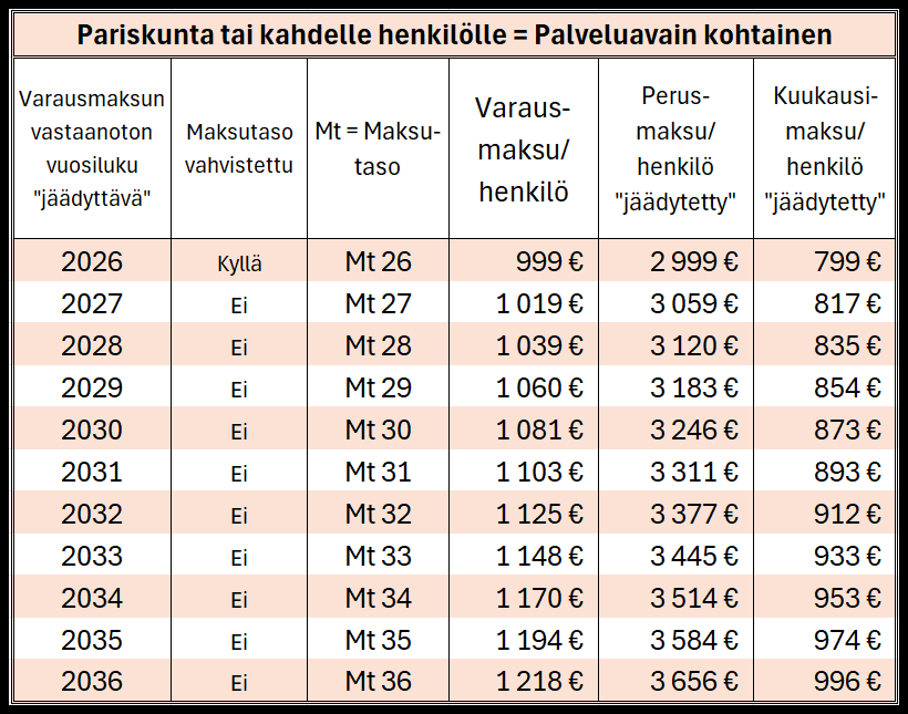 Maksutasot Mt 27-36 vahvistetaan aina edeltävien vuosien 20. joulukuuta mennessä. Maksu muutokset eivät juurikaan enään vaikuta taulukon lukuihin siksi, että maksutasoissa on jo huomioitu ennakoivasti 2 % vuosittainen korotus.
