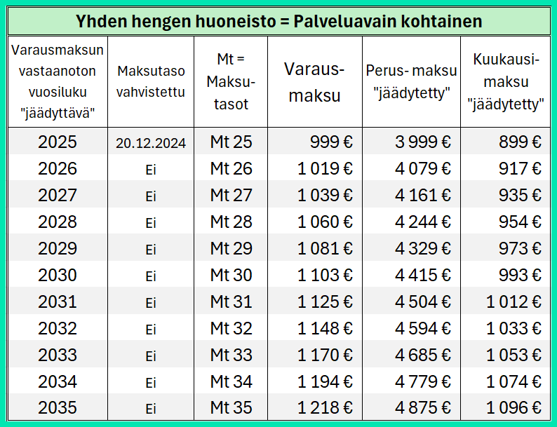 Maksutasot Mt 26-35 vahvistetaan aina edeltävän vuoden 20. joulukuuta mennessä. Maksu muutokset eivät juurikaan enään vaikuta taulukon lukuihin siksi, että maksutasoissa on jo huomioitu ennakoivasti 2 % vuosittainen korotus.